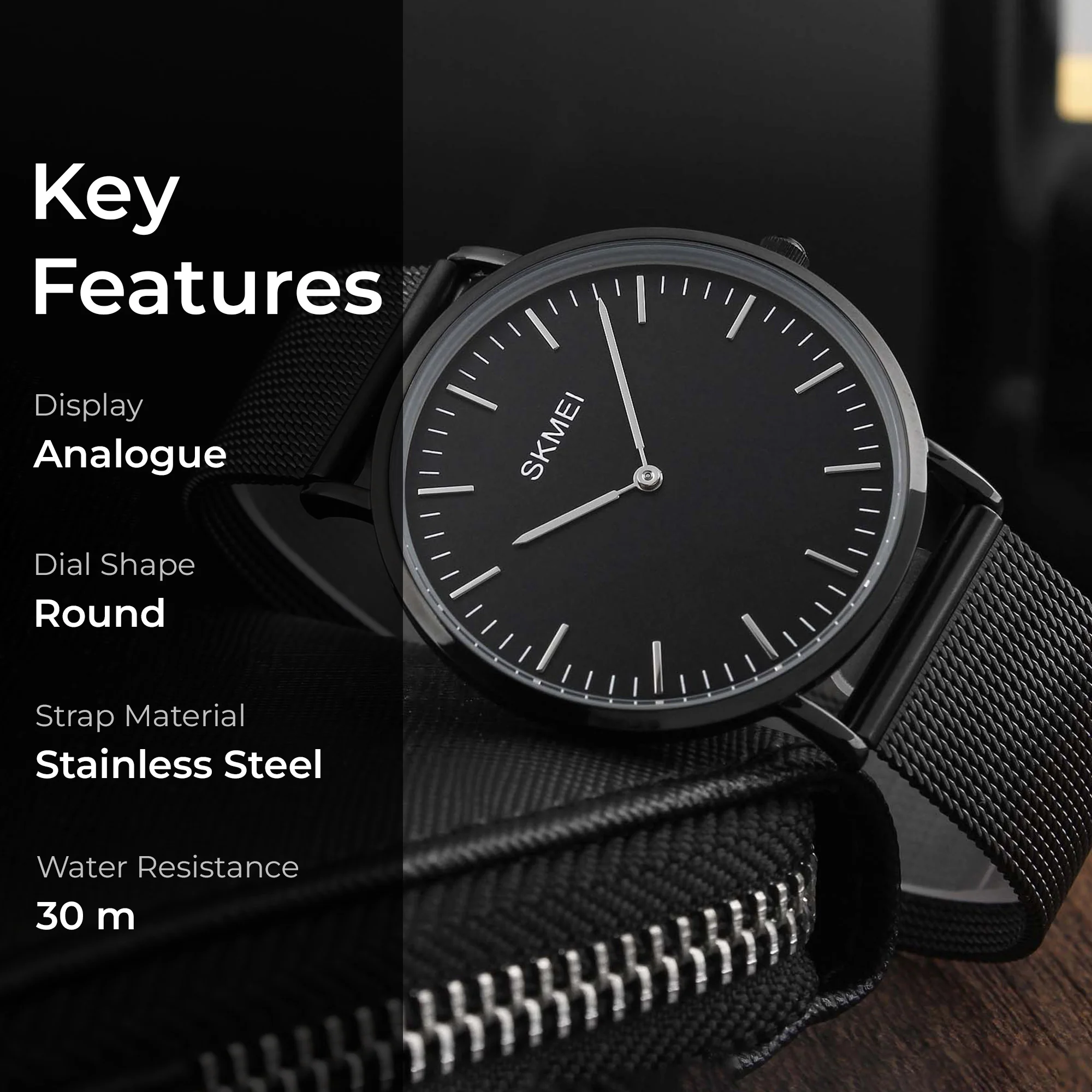 The SKMEI 40 mm quartz watch features a minimalist design perfect for both casual and formal wear. With a durable stainless-steel case, lightweight mesh band, and 30M water resistance, it ensures reliability. The precise quartz movement guarantees accuracy, making it a stylish everyday accessory.