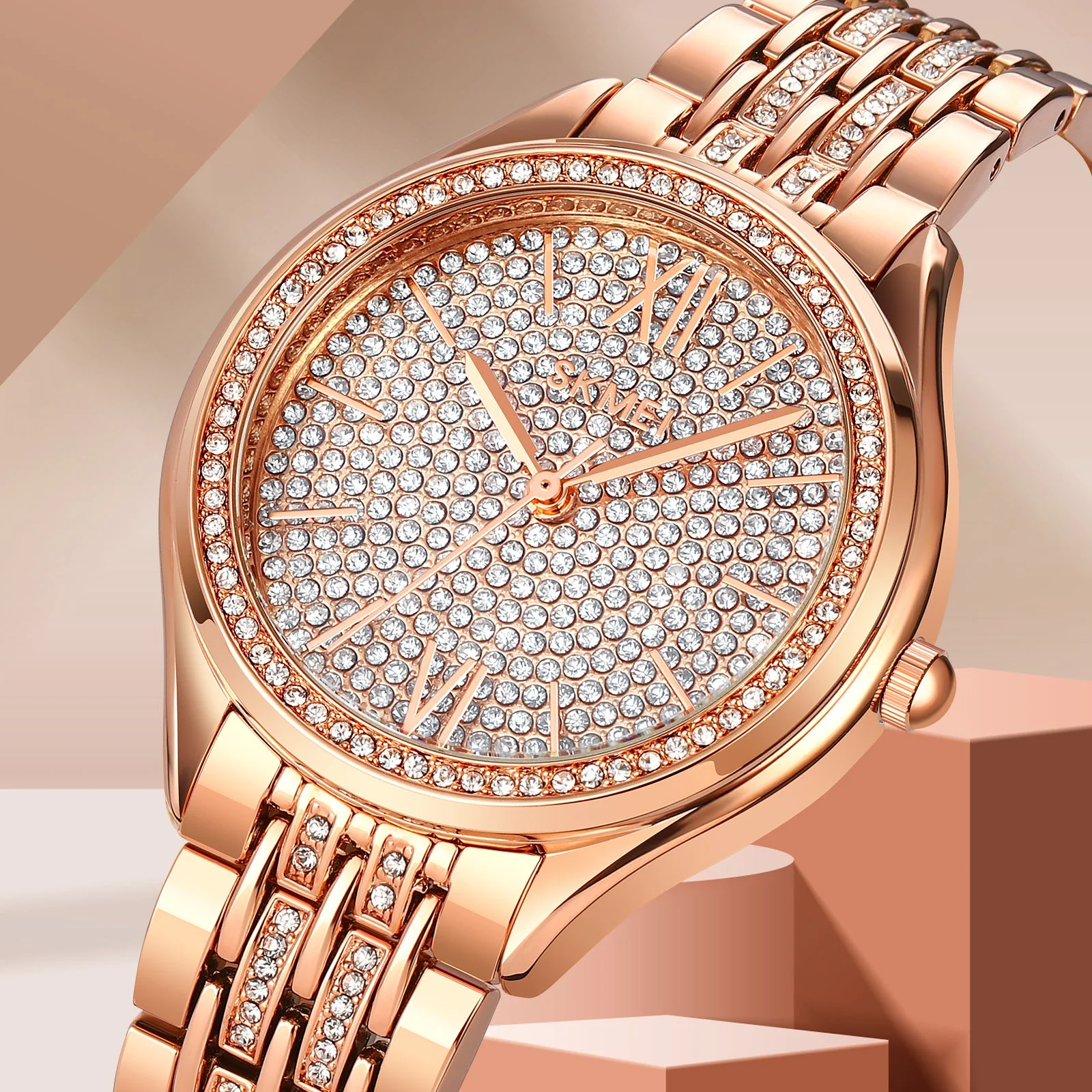 This womens watch by SKMEI, available in two colors, exudes elegance and a regal charm. Powered by quartz movement for precise timekeeping, it is embellished with crystals for a touch of luxury. Featuring 30M water resistance and a zinc alloy case and band, it combines style and sophistication perfectly.